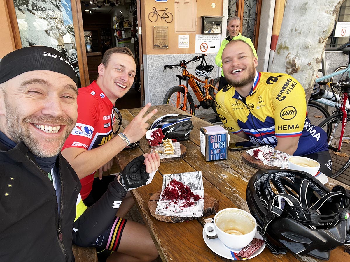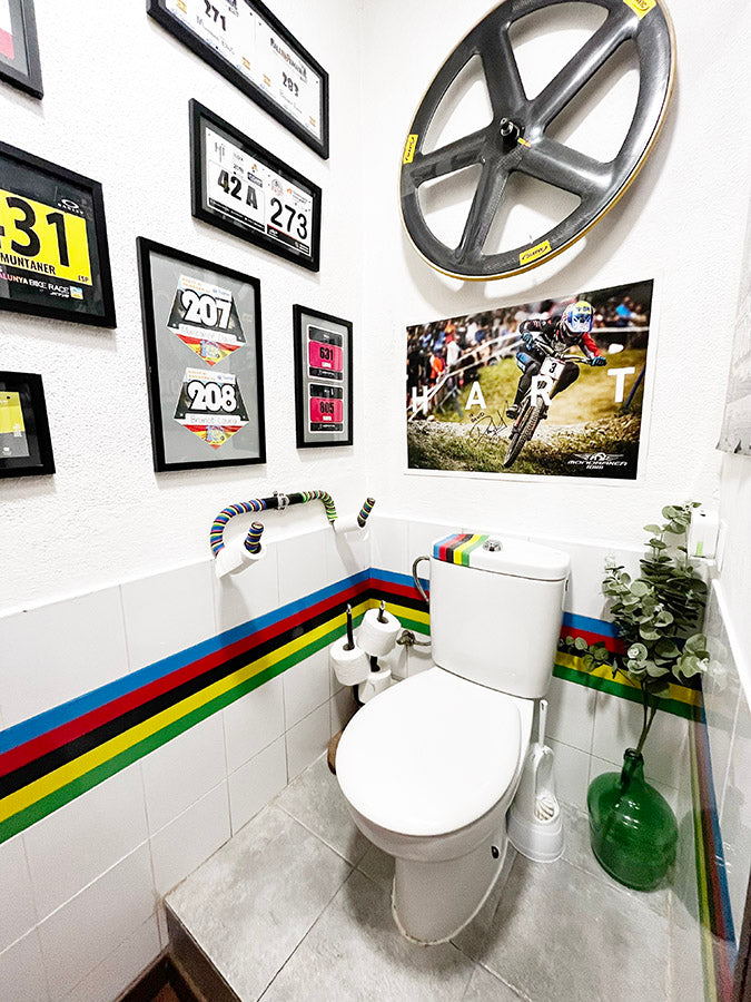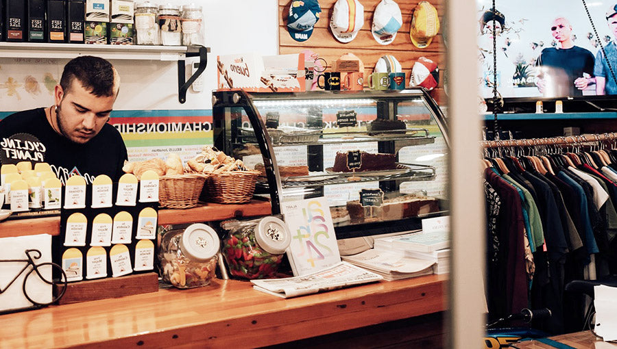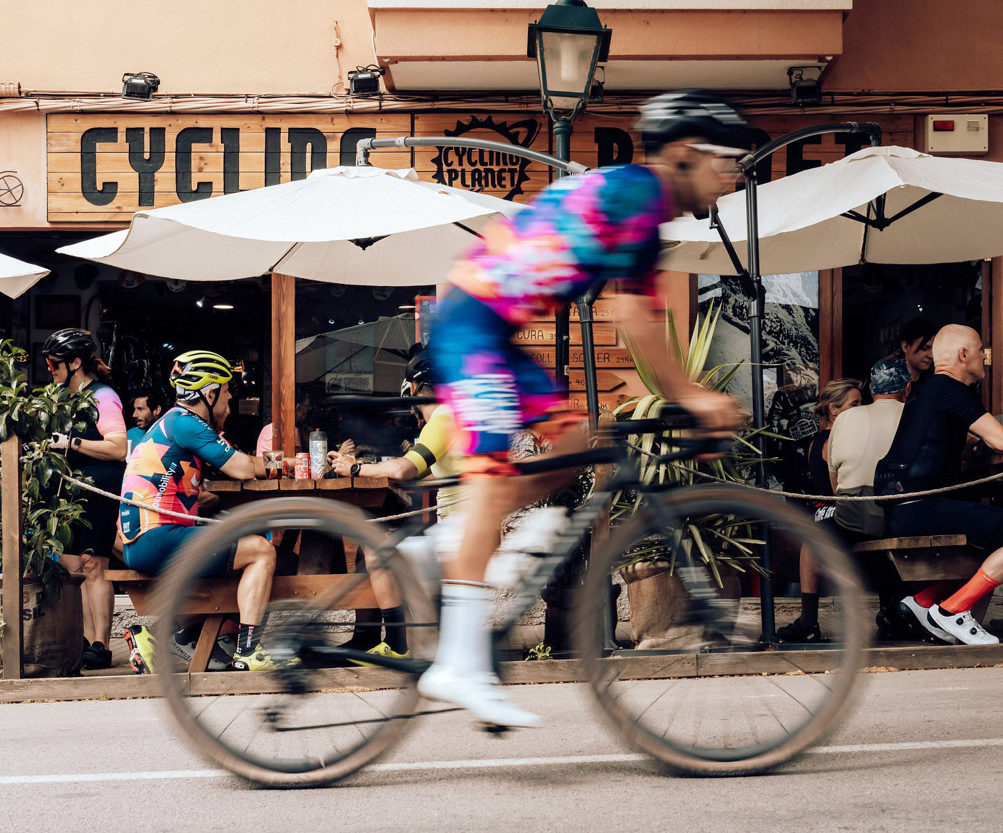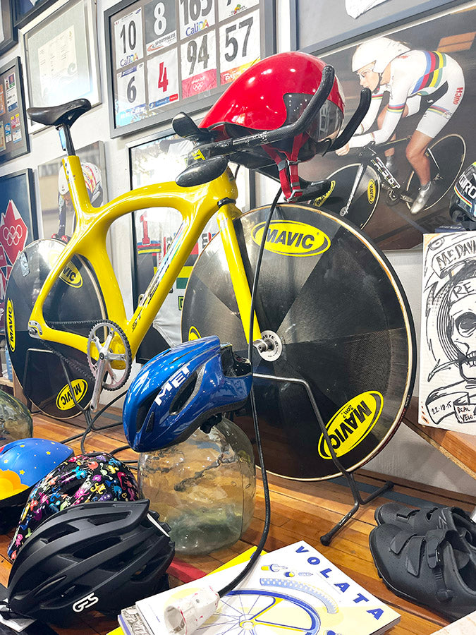 When you arrive at Cycling Planet the first thing you'll notice is the sea of people inside and out - it's popular, and buzzing with life. From the outside there is plenty of seating, and signs showing the distance to famous climbs are a nice touch under the shade of trees. Inside is an Aladin's cave of cycling treasures. The shop offers a range of Gobik clothing, spares & souvenirs, and the workshop out the back will help rectify any niggles you might have on the bike. But it's the wealth of history and colourful display of bike parts around the walls that draws your attention. Think London 2012 Athlete accreditations, race numbers, photo finishes and bikes. A strong theme of track racing nods to Sebastian's successful career, framed wonderfully by the back wall (which is covered in wooden panels - actually the original track from Palma velodrome!).